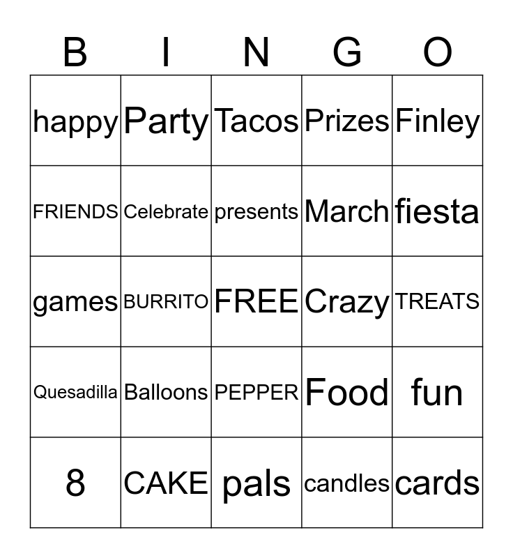 This bingo card has a free space and 24 words: Balloons, CAKE, presents, 8, Finley, happy, FRIENDS, Party, Crazy, PEPPER, March, games, Food, fun, Celebrate, candles, TREATS, Tacos, fiesta, BURRITO, cards, Quesadilla, Prizes and pals.