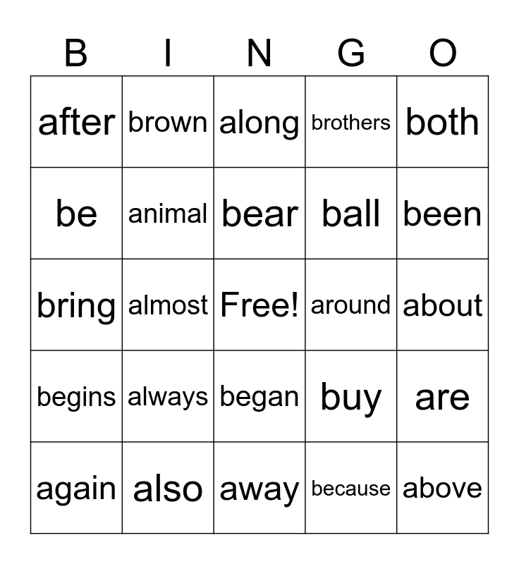 This bingo card has a free space and 29 words: again, all, almost, across, after, along, animal, always, around, also, about, above, away, because, been, before, began, begins, both, bring, buy, blue, ball, be, brothers, brown, are, bear and beautiful.