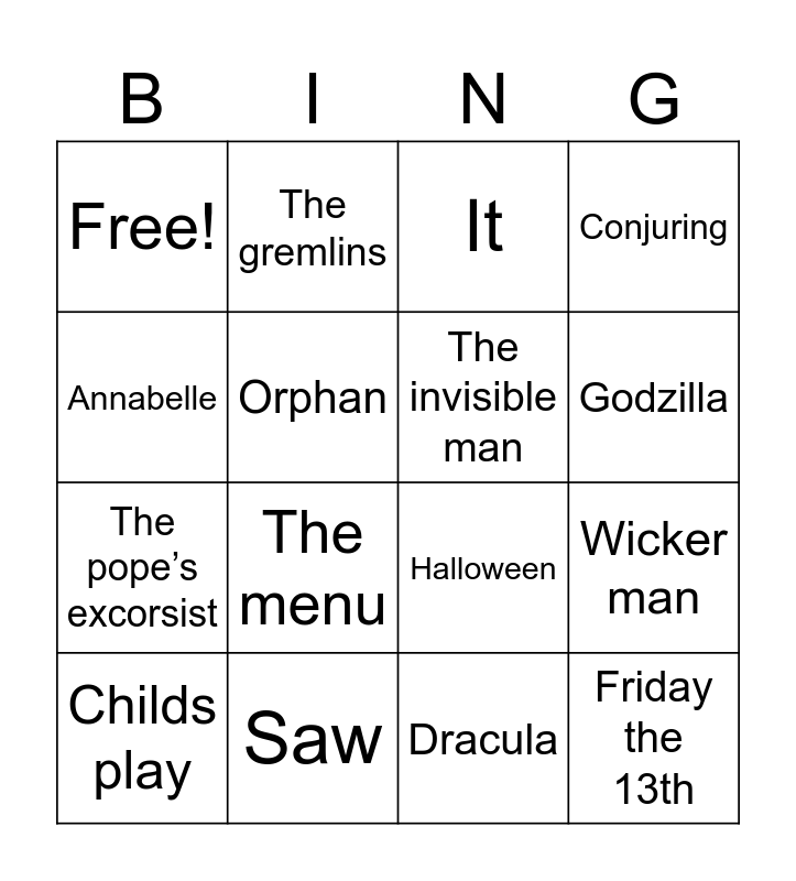 This bingo card has 16 words: Childs play, Saw, It, Conjuring, Annabelle, The gremlins, Halloween, Wicker man, Free!, Orphan, Dracula, Godzilla, The pope’s excorsist, The menu, The invisible man and Friday the 13th.