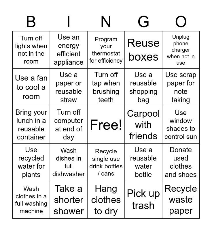 This bingo card has a free space and 24 words: Wash dishes in full dishwasher, Take a shorter shower, Turn off tap when brushing teeth, Wash clothes in a full washing machine, Unplug phone charger when not in use, Turn off lights when not in the room, Use a fan to cool a room, Use an energy efficient appliance, Carpool with friends, Recycle single use drink bottles / cans, Use a reusable shopping bag, Bring your lunch in a reusable container, Use a reusable water bottle, Donate used clothes and shoes, Use a paper or reusable straw, Pick up trash, Use window shades to control sun, Program your thermostat for efficiency, Use scrap paper for note taking, Turn off computer at end of day, Recycle waste paper, Use recycled water for plants, Reuse boxes and Hang clothes to dry.