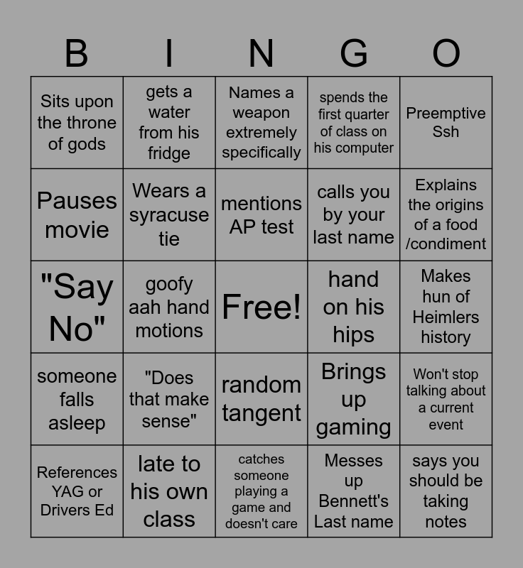 This bingo card has a free space and 24 words: "Does that make sense", late to his own class, mentions AP test, References YAG or Drivers Ed, Preemptive Ssh, Sits upon the throne of gods, Pauses movie, gets a water from his fridge, hand on his hips, random tangent, calls you by your last name, "Say No", Brings up gaming, Won't stop talking about a current event, Wears a syracuse tie, Messes up Bennett's Last name, Makes hun of Heimlers history, Names a weapon extremely specifically, Explains the origins of a food /condiment, goofy aah hand motions, says you should be taking notes, someone falls asleep, spends the first quarter of class on his computer and catches someone playing a game and doesn't care.