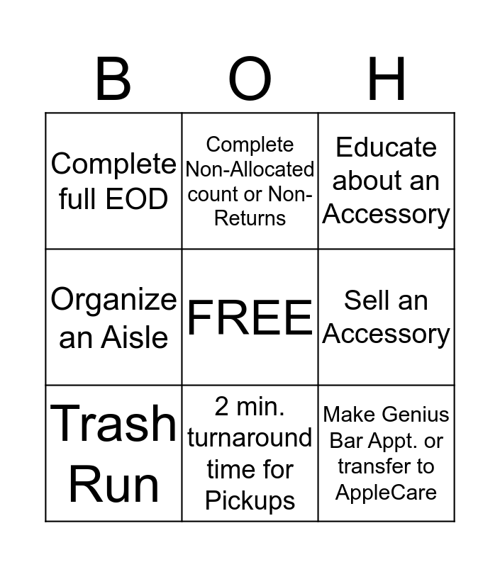 This bingo card has a free space and 8 words: Sell an Accessory, Educate about an Accessory, Complete Non-Allocated count or Non-Returns, Trash Run, Complete full EOD, Make Genius Bar Appt. or transfer to AppleCare, Organize an Aisle and 2 min. turnaround time for Pickups.