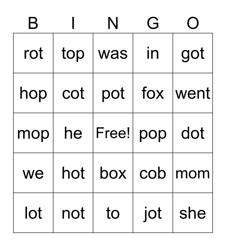 This bingo card has a free space and 24 words: hot, not, pot, lot, got, rot, hop, top, pop, box, fox, mop, cob, mom, cot, jot, dot, was, went, he, she, we, in and to.