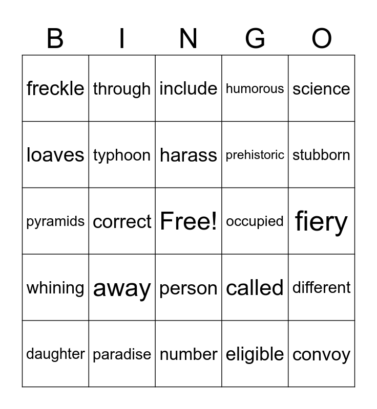 This bingo card has a free space and 29 words: daughter, language, correct, preview, freckle, include, typhoon, away, occupied, paradise, fiery, convoy, number, eligible, stubborn, fought, person, whining, science, pyramids, called, supreme, prehistoric, loaves, humorous, through, different, harass and grateful.