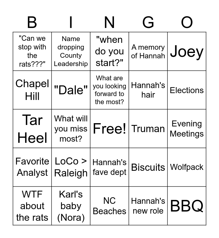 This bingo card has a free space and 24 words: LoCo > Raleigh, Karl's baby (Nora), What are you looking forward to the most?, WTF about the rats, Joey, "Can we stop with the rats???", Chapel Hill, Name dropping County Leadership, Truman, Hannah's fave dept, Hannah's hair, Tar Heel, Biscuits, Wolfpack, "Dale", Hannah's new role, Evening Meetings, "when do you start?", Elections, What will you miss most?, BBQ, Favorite Analyst, A memory of Hannah and NC Beaches.