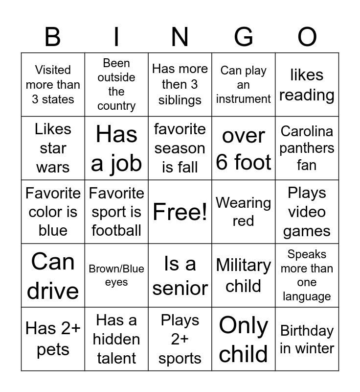 This bingo card has a free space and 24 words: Has 2+ pets, Brown/Blue eyes, favorite season is fall, Only child, likes reading, Visited more than 3 states, Been outside the country, Has more then 3 siblings, Wearing red, Plays video games, Favorite color is blue, Has a job, Military child, Speaks more than one language, Likes star wars, Has a hidden talent, Plays 2+ sports, Can play an instrument, Carolina panthers fan, Can drive, Favorite sport is football, Is a senior, over 6 foot and Birthday in winter.