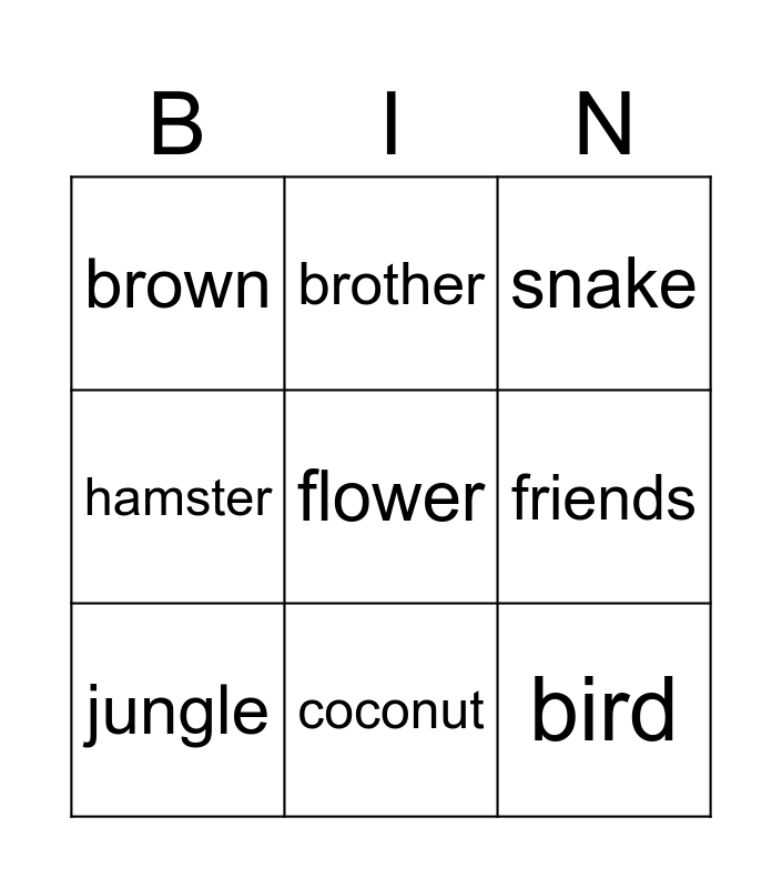 This bingo card has 28 words: tiger, scrapbook, bird, elephant, friends, snake, brother, sister, red, green, yellow, hamster, rabbit, lizard, family, ruler, classroom, jungle, coconut, bush, brown, black, eraser, pencil, white, pen, flower and cat.