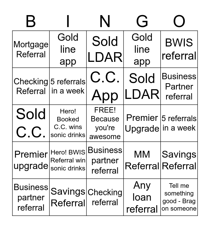 This bingo card has a free space and 24 words: Hero! BWIS Referral win sonic drinks, Savings Referral, C.C. App, Business partner referral, BWIS referral, Mortgage Referral, Checking Referral, Gold line app, Premier Upgrade, Business partner referral, Sold LDAR, Sold C.C., MM Referral, Savings Referral, 5 referrals in a week, Any loan referral, 5 referrals in a week, Sold LDAR, Business Partner referral, Hero! Booked C.C. wins sonic drinks, Tell me something good - Brag on someone, Premier upgrade, Gold line app and Checking referral.