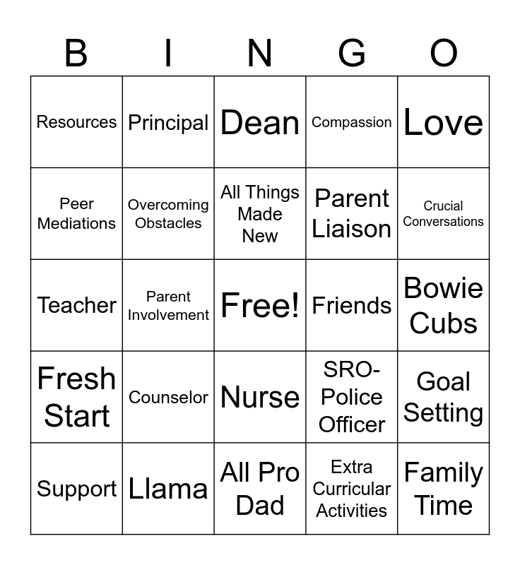 This bingo card has a free space and 24 words: Counselor, Llama, All Things Made New, Support, Love, Resources, Peer Mediations, Principal, Friends, Nurse, Parent Liaison, Teacher, SRO- Police Officer, Goal Setting, Overcoming Obstacles, Extra Curricular Activities, Bowie Cubs, Dean, Crucial Conversations, Parent Involvement, Family Time, Fresh Start, Compassion and All Pro Dad.