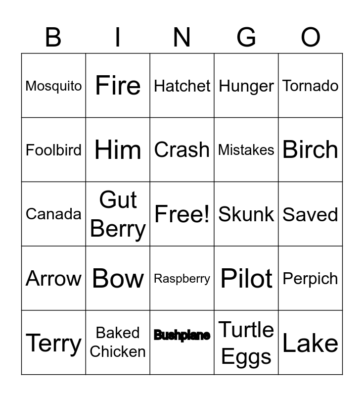 This bingo card has a free space and 31 words: Bushplane, Oil Fields, Gut Berry, Meat Day, Mosquito, Hatchet, Him, Pilot, Skunk, Turtle Eggs, Saved, Lake, Divorce, Spark, Birch, Ridge, Perpich, Bow, Arrow, Raspberry, Tornado, Secret, Terry, Fire, Mistakes, Foolbird, Hunger, Canada, Baked Chicken, Crash and Bear.