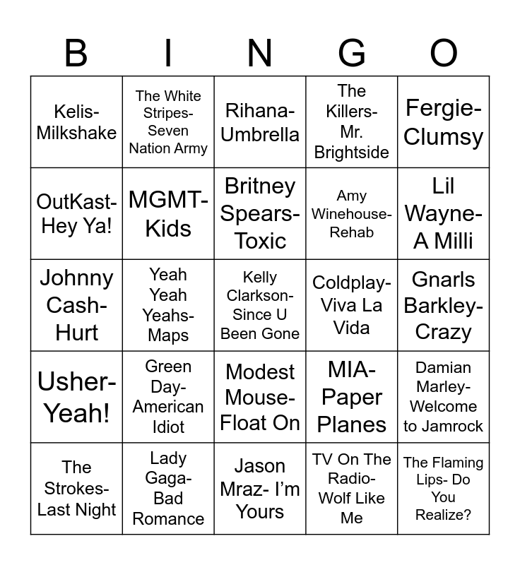 This bingo card has 28 words: Damian Marley- Welcome to Jamrock, Gorillaz- Feel Good Inc., Amy Winehouse- Rehab, TV On The Radio- Wolf Like Me, OutKast- Hey Ya!, Rihana- Umbrella, The White Stripes- Seven Nation Army, Usher- Yeah!, Coldplay- Viva La Vida, The Strokes- Last Night, Johnny Cash- Hurt, The Killers- Mr. Brightside, Lady Gaga- Bad Romance, Jason Mraz- I’m Yours, Lil Wayne- A Milli, Beyonce- Single Ladies, Green Day- American Idiot, MGMT- Kids, Britney Spears- Toxic, Modest Mouse- Float On, Kelis- Milkshake, The Flaming Lips- Do You Realize?, Kelly Clarkson- Since U Been Gone, Yeah Yeah Yeahs- Maps, Gnarls Barkley- Crazy, MIA- Paper Planes, Fergie- Clumsy and T.I.- Whatever You Like.