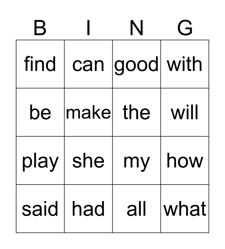 This bingo card has a free space and 15 words: said, what, good, find, will, be, she, all, make, play, how, with, the, can and had.