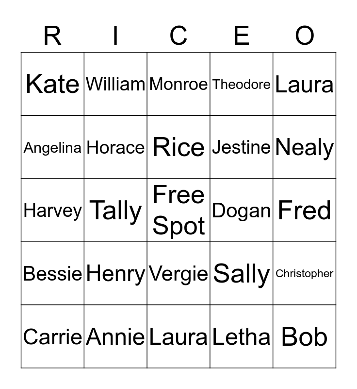 This bingo card has a free space and 24 words: Henry, Annie, Rice, Carrie, Laura, Kate, Angelina, William, Dogan, Vergie, Jestine, Harvey, Sally, Christopher, Horace, Letha, Fred, Monroe, Nealy, Tally, Bob, Bessie, Theodore and Laura.