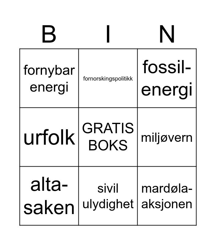 This bingo card has a free space and 11 words: miljøverndepartamanget, sivil ulydighet, mardøla-aksjonen, alta-saken, fornorskingspolitikk, fossil-energi, miljøvern, fosen-saken, urfolk, fornybar energi and ikke fornybar energi.