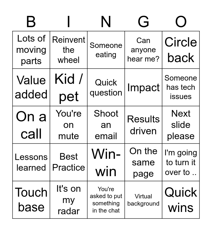 This bingo card has a free space and 24 words: Best Practice, It's on my radar, Quick question, Touch base, Circle back, Lots of moving parts, Value added, Reinvent the wheel, Results driven, Win-win, Impact, On a call, On the same page, I'm going to turn it over to .., Kid / pet, Virtual background, Next slide please, Someone eating, Someone has tech issues, You're on mute, Quick wins, Lessons learned, Can anyone hear me? and You're asked to put something in the chat.