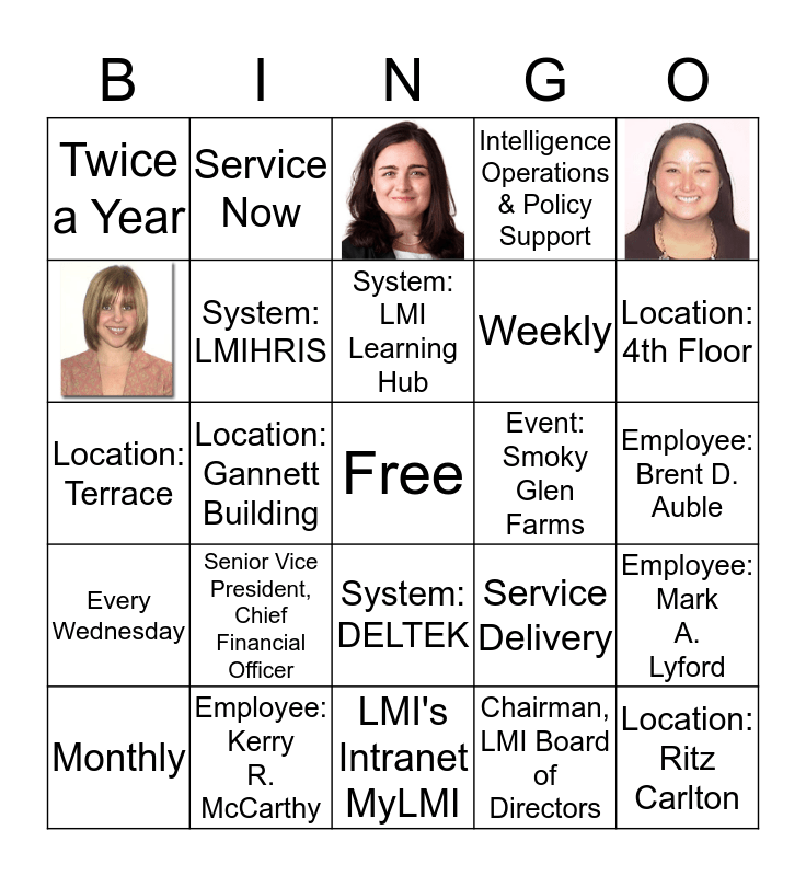 This bingo card has 3 images, a free space and 21 words: Senior Vice President, Chief Financial Officer, Employee: Kerry R. McCarthy, System: LMI Learning Hub, Monthly, Twice a Year, Service Now, Event: Smoky Glen Farms, System: DELTEK, Weekly, Location: Terrace, Service Delivery, Employee: Mark A. Lyford, System: LMIHRIS, Chairman, LMI Board of Directors, Employee: Brent D. Auble, Location: 4th Floor, Location: Gannett Building, Location: Ritz Carlton, Every Wednesday, Intelligence Operations & Policy Support and LMI's Intranet MyLMI.