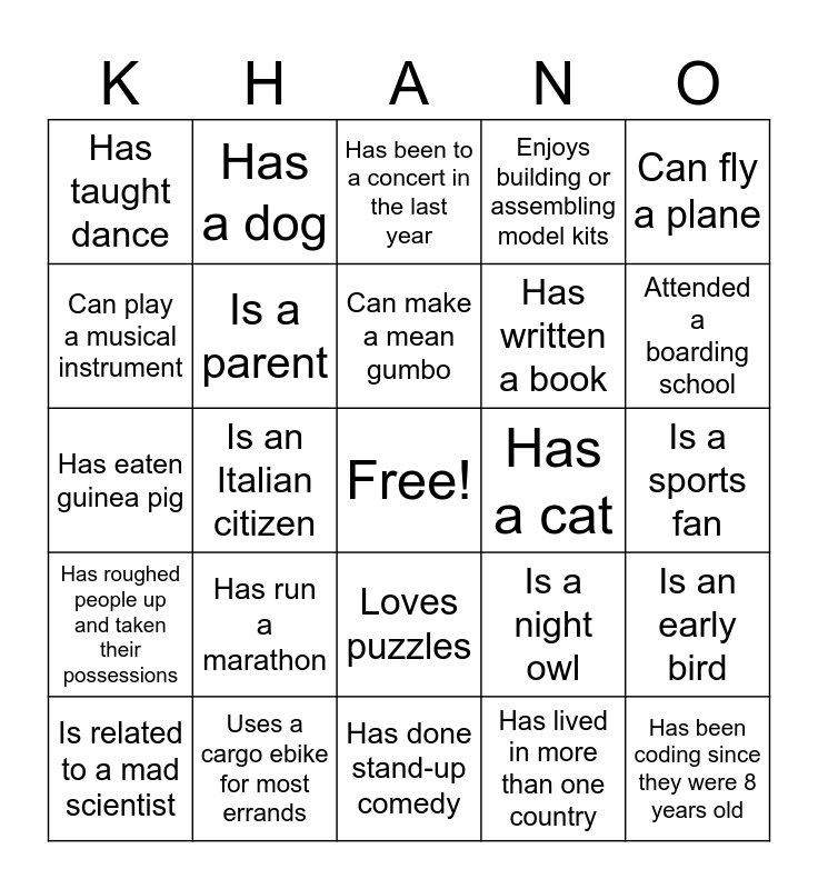 This bingo card has a free space and 24 words: Has run a marathon, Uses a cargo ebike for most errands, Can make a mean gumbo, Is related to a mad scientist, Can fly a plane, Has taught dance, Can play a musical instrument, Has a dog, Has a cat, Loves puzzles, Has written a book, Has eaten guinea pig, Is a night owl, Is an early bird, Is a parent, Has lived in more than one country, Is a sports fan, Has been to a concert in the last year, Attended a boarding school, Is an Italian citizen, Has been coding since they were 8 years old, Has roughed people up and taken their possessions, Enjoys building or assembling model kits and Has done stand-up comedy.