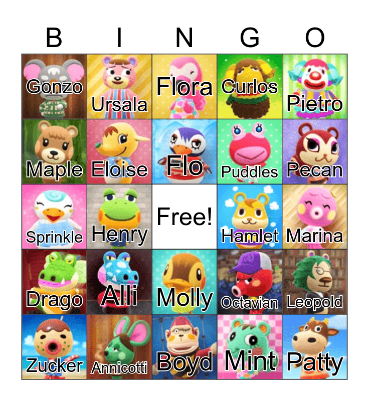 This bingo card has 24 images, a free space and 24 words: Alli, Annicotti, Flo, Zucker, Pietro, Gonzo, Maple, Ursala, Hamlet, Molly, Puddles, Sprinkle, Octavian, Leopold, Eloise, Mint, Marina, Flora, Pecan, Henry, Patty, Drago, Curlos and Boyd.
