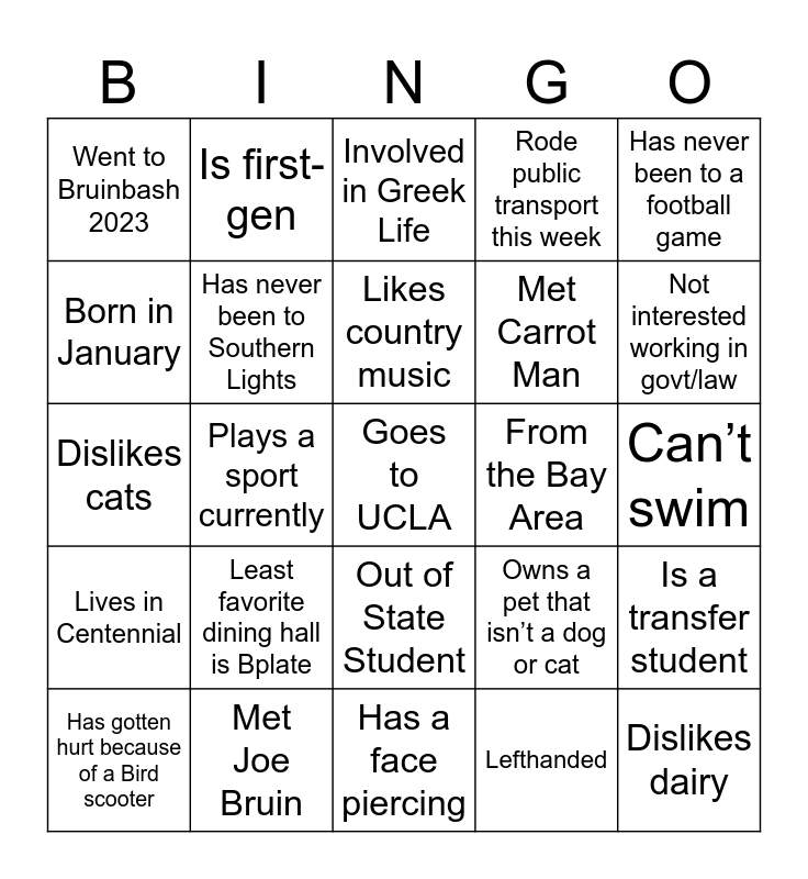 This bingo card has a free space and 24 words: Least favorite dining hall is Bplate, Met Joe Bruin, Likes country music, Has gotten hurt because of a Bird scooter, Has never been to a football game, Went to Bruinbash 2023, Born in January, Is first-gen, From the Bay Area, Out of State Student, Met Carrot Man, Dislikes cats, Owns a pet that isn’t a dog or cat, Is a transfer student, Has never been to Southern Lights, Lefthanded, Can’t swim, Involved in Greek Life, Not interested working in govt/law, Plays a sport currently, Dislikes dairy, Lives in Centennial, Rode public transport this week and Has a face piercing.