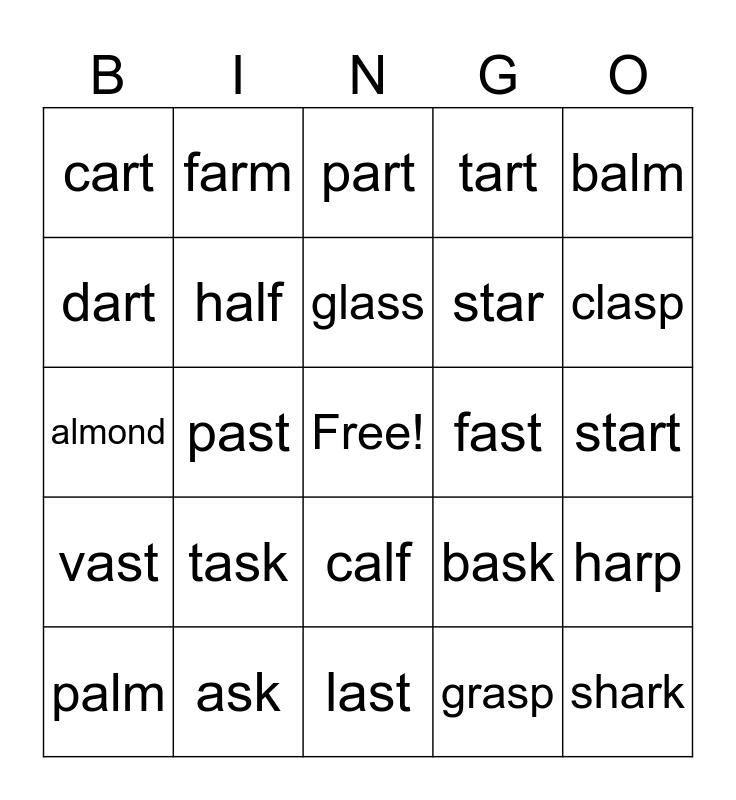 This bingo card has a free space and 30 words: ask, flask, past, mast, cart, part, half, calf, fast, last, start, shark, grasp, blast, clasp, cast, bask, vast, task, balm, almond, garden, farm, star, dart, tart, harp, palm, glass and pass.