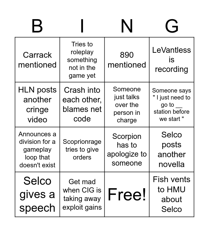This bingo card has 17 words: Free!, Selco gives a speech, 890 mentioned, Carrack mentioned, Scoprionrage tries to give orders, LeVantless is recording, Selco posts another novella, Someone just talks over the person in charge, Someone says " I just need to go to __ station before we start ", Crash into each other, blames net code, Get mad when CIG is taking away exploit gains, Scorpion has to apologize to someone, HLN posts another cringe video, Tries to roleplay something not in the game yet, Announces a division for a gameplay loop that doesn't exist, Fleet command isn't giving orders and Fish vents to HMU about Selco.