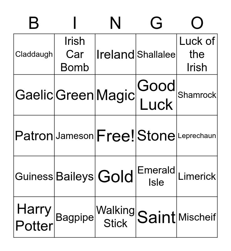 This bingo card has a free space and 24 words: Baileys, Bagpipe, Magic, Harry Potter, Luck of the Irish, Claddaugh, Gaelic, Irish Car Bomb, Stone, Gold, Good Luck, Patron, Emerald Isle, Limerick, Green, Saint, Leprechaun, Ireland, Shamrock, Jameson, Mischeif, Guiness, Shallalee and Walking Stick.