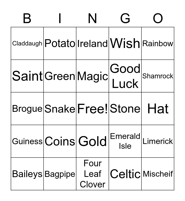 This bingo card has a free space and 24 words: Coins, Bagpipe, Magic, Baileys, Rainbow, Claddaugh, Saint, Potato, Stone, Gold, Good Luck, Brogue, Emerald Isle, Limerick, Green, Celtic, Hat, Ireland, Shamrock, Snake, Mischeif, Guiness, Wish and Four Leaf Clover.