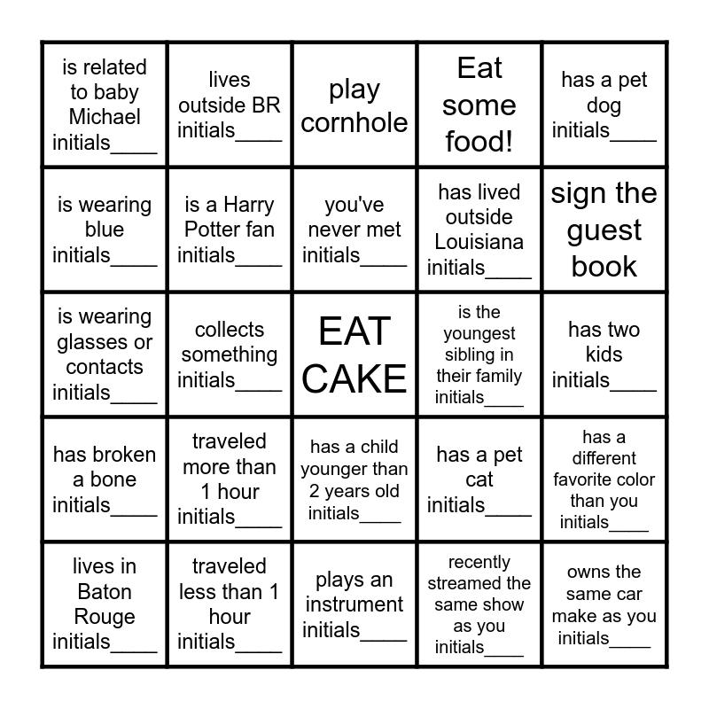 This bingo card has a free space and 24 words: traveled more than 1 hour initials____, traveled less than 1 hour initials____, you've never met initials____, lives in Baton Rouge initials____, has a pet dog initials____, is related to baby Michael initials____, is wearing blue initials____, lives outside BR initials____, is the youngest sibling in their family initials____, has a child younger than 2 years old initials____, has lived outside Louisiana initials____, is wearing glasses or contacts initials____, has a pet cat initials____, has a different favorite color than you initials____, is a Harry Potter fan initials____, recently streamed the same show as you initials____, has two kids initials____, play cornhole, sign the guest book, collects something initials____, owns the same car make as you initials____, has broken a bone initials____, Eat some food! and plays an instrument initials____.