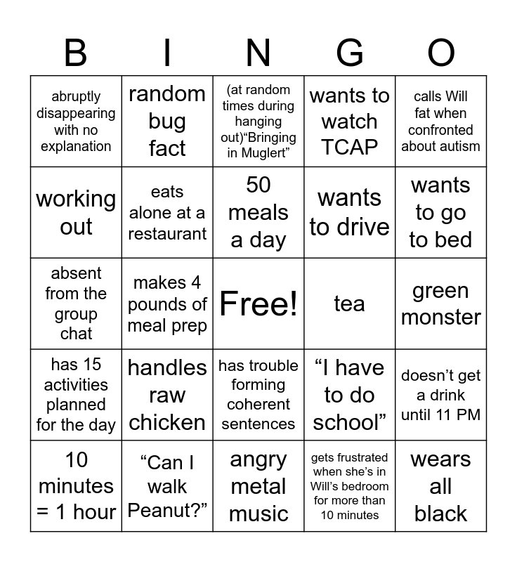 This bingo card has a free space and 24 words: handles raw chicken, “Can I walk Peanut?”, 50 meals a day, 10 minutes = 1 hour, calls Will fat when confronted about autism, abruptly disappearing with no explanation, working out, random bug fact, tea, has trouble forming coherent sentences, wants to drive, absent from the group chat, “I have to do school”, doesn’t get a drink until 11 PM, eats alone at a restaurant, gets frustrated when she’s in Will’s bedroom for more than 10 minutes, green monster, (at random times during hanging out)“Bringing in Muglert”, wants to go to bed, makes 4 pounds of meal prep, wears all black, has 15 activities planned for the day, wants to watch TCAP and angry metal music.