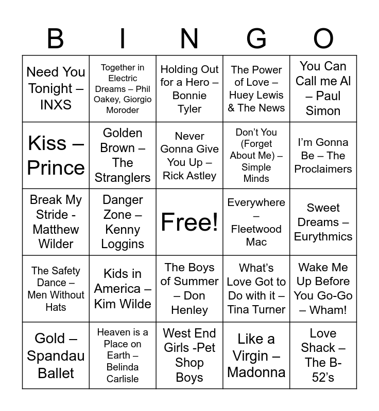 This bingo card has a free space and 100 words: Africa – TOTO, Take on Me – A-HA, Sweet Dreams – Eurythmics, Everybody Wants to Rule the World – Tears for Fears, I Wanna Dance with Somebody – Whitney Houston, Footloose – Kenny Loggins, I’m Still Standing – Elton John, Girls Just Want to Have Fun – Cyndi Lauper, Tainted Love – Soft Cell, Dancing on the Ceiling – Lionel Richie, You Make My Dreams Come True – Hall & Oates, Maniac – Michael Sembello, Summer of ’69 – Bryan Adams, Heaven is a Place on Earth – Belinda Carlisle, Don’t Stop Believin’ – Journey, Under Pressure – Queen, Davie Bowie, Don’t You (Forget About Me) – Simple Minds, We Don’t Have to Take Our Clothes Off- Jermaine Stewart, I’m So Excited – The Pointer Sisters, Down Under – Men At Work, You Give Love a Bad Name – Bon Jovi, We Built This City- Starship, Beat It – Michael Jackson, Funkytown – Lipps Inc., Bette Davis Eyes – Kim Carnes, Everywhere – Fleetwood Mac, You Can Call me Al – Paul Simon, What’s Love Got to Do with it – Tina Turner, Come on Eileen – Dexys Midnight Runners, Just Can’t Get Enough – Depeche Mode, Danger Zone – Kenny Loggins, Need You Tonight – INXS, Let’s Hear it for the Boy – Deniece Williams, You Spin Me Round – Dead or Alive, Like a Virgin – Madonna, Never Gonna Give You Up – Rick Astley, Wake Me Up Before You Go-Go – Wham!, Our House – Madness, Blue Monday – New Order, I Think We’re Alone Now – Tiffany, Karma Chameleon – Culture Club, Jump – Van Halen, Break My Stride - Matthew Wilder, Red Red Wine – UB40, I’m Gonna Be – The Proclaimers, Holding Out for a Hero – Bonnie Tyler, Walk of Life – Dire Straits, Easy Lover – Philip Bailey, Phil Collins, Wideo Killed the Radio Star – The Buggles, West End Girls -Pet Shop Boys, Tell it To My Heart – Taylor Dayne, Don’t You Want Me – The Human League, Hungry Eyes – Eric Carmen, All Night Long – Lionel Richie, White Wedding – Billy Idol, Like a Prayer- Madonna, Walk This Way – Run D.M.C., Aerosmith, Uptown Girl – Billy Joel, Ain’t Nobody – Chaka Khan, The Power of Love – Huey Lewis & The News, Relax – Frankie Goes to Hollywood, She Drives me Crazy – Fine Young Cannibals, What a Feeling – Irene Cara, True – Spandau Ballet, You Can’t Hurry Love – Phil Collins, Close to Me – The Cure, I Still Haven’t Found What I’m Looking For – U2, Eye of the Tiger – Survivor, Thriller – Michael Jackson, Walking on Sunshine – Katrina & The Waves, Hungry Like the Wolf – Duran Duran, Kids in America – Kim Wilde, Faith – George Michael, Every Little Thing She Does is Magic - The Police, Got My Mind Set On You – George Harrison, Here I Go Again – Whitesnake, Word Up – Cameo, Kiss – Prince, Get Down On It – Kool & The Gang, Higher Love - Steven Winwood, A Little Respect – Erasure, Love Shack – The B-52’s, 99 Red Balloons – Nena, The Boys of Summer – Don Henley, Start Me Up – The Rolling Stones, Together in Electric Dreams – Phil Oakey, Giorgio Moroder, Never Too Much – Luther Vandross, Super Trouper – ABBA, Love Will Tear Us Apart – Joy Division, The Safety Dance – Men Without Hats, Loco in Acapulco – Four Tops, Chain Reaction – Diana Ross, Teardrops – Womack & Womack, Gold – Spandau Ballet, Golden Brown – The Stranglers, Hip to Be Aquare – Huey Lewis & The News, Invisible Touch – Genesis, Don’t Leave Me This Way – The Communards, Sarah Jane Morris, Sexual Healing – Marvin Gaye and Raspberry Beret - Prince.
