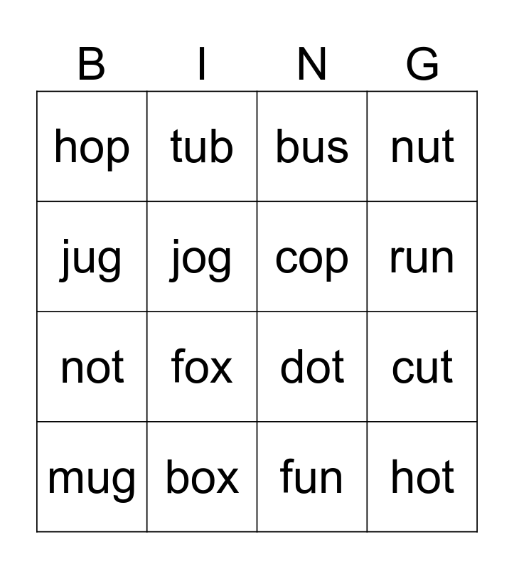 This bingo card has 16 words: box, cut, bus, hop, not, tub, dot, fun, jug, jog, mug, nut, fox, run, cop and hot.