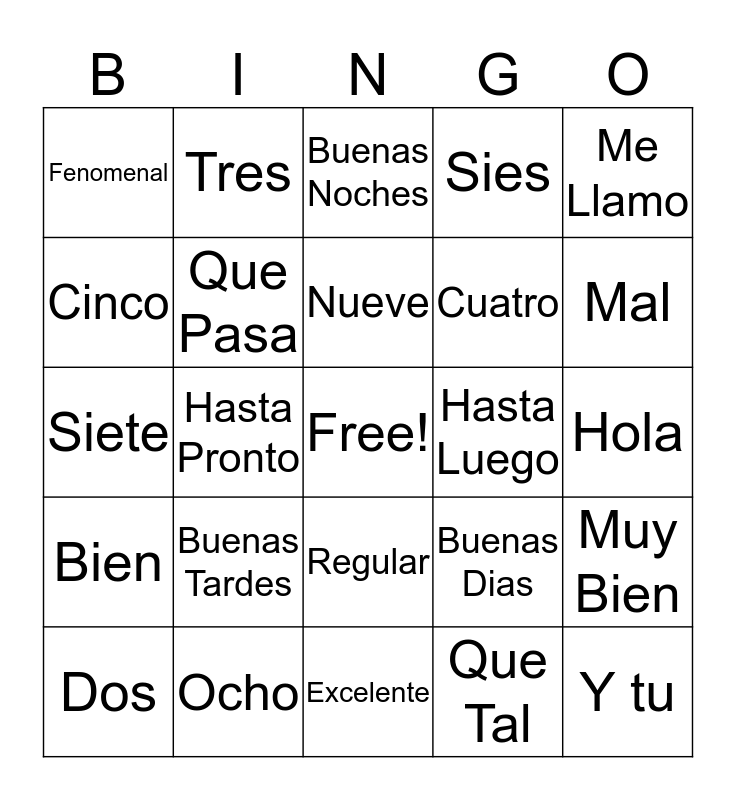 This bingo card has a free space and 31 words: Excelente, Hasta Manana, Hasta Pronto, Terrible, Fenomenal, Buenas Noches, Que Pasa, Buenas Dias, Hasta Luego, Que Tal, Hola, Y tu, Muy Mal, Como Estas, Mal, Adios, Muy Bien, Buenas Tardes, Bien, Regular, Me Llamo, Uno, Dos, Tres, Cuatro, Cinco, Sies, Siete, Ocho, Nueve and Diez.