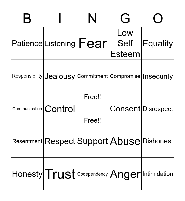 This bingo card has a free space and 24 words: Respect, Trust, Commitment, Honesty, Equality, Patience, Responsibility, Listening, Consent, Support, Compromise, Communication, Abuse, Dishonest, Jealousy, Anger, Disrespect, Fear, Insecurity, Control, Intimidation, Resentment, Low Self Esteem and Codependency.