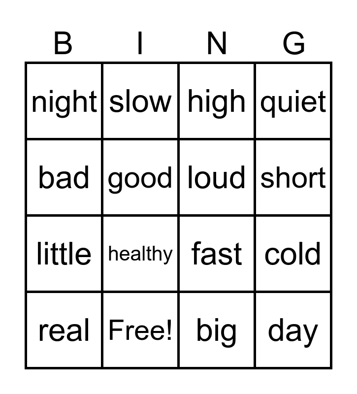 This bingo card has 21 words: Free!, low, slow, tall, big, loud, night, high, fast, short, little, quiet, day, sick, good, hot, real, healthy, bad, cold and fake.