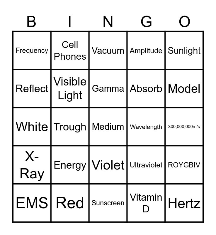 This bingo card has 36 words: Radiowaves, Microwaves, Infrared, Visible Light, Ultraviolet, X-Ray, Gamma, High Frequency, Sunlight, Crest, Trough, Amplitude, Free!, Wavelength, Model, Frequency, Hertz, Energy, Medium, Vacuum, 300,000,000m/s, ROYGBIV, Red, EMS, Sunscreen, Cell Phones, White, Black, Absorb, Reflect, Refract, Sound waves, Vitamin D, Violet, Prism and Mirror.