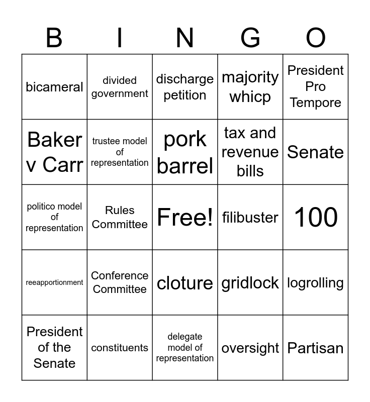 This bingo card has a free space and 24 words: Conference Committee, constituents, pork barrel, President of the Senate, President Pro Tempore, bicameral, Baker v Carr, divided government, filibuster, cloture, tax and revenue bills, politico model of representation, gridlock, logrolling, trustee model of representation, oversight, 100, discharge petition, Senate, Rules Committee, Partisan, reeapportionment, majority whicp and delegate model of representation.