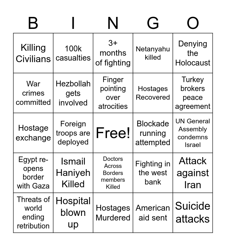 This bingo card has a free space and 24 words: Ismail Haniyeh Killed, Hospital blown up, Finger pointing over atrocities, Threats of world ending retribution, Denying the Holocaust, Killing Civilians, War crimes committed, 100k casualties, Blockade running attempted, Doctors Across Borders members Killed, Hostages Recovered, Hostage exchange, Fighting in the west bank, Attack against Iran, Hezbollah gets involved, American aid sent, UN General Assembly condemns Israel, 3+ months of fighting, Turkey brokers peace agreement, Foreign troops are deployed, Suicide attacks, Egypt re-opens border with Gaza, Netanyahu killed and Hostages Murdered.
