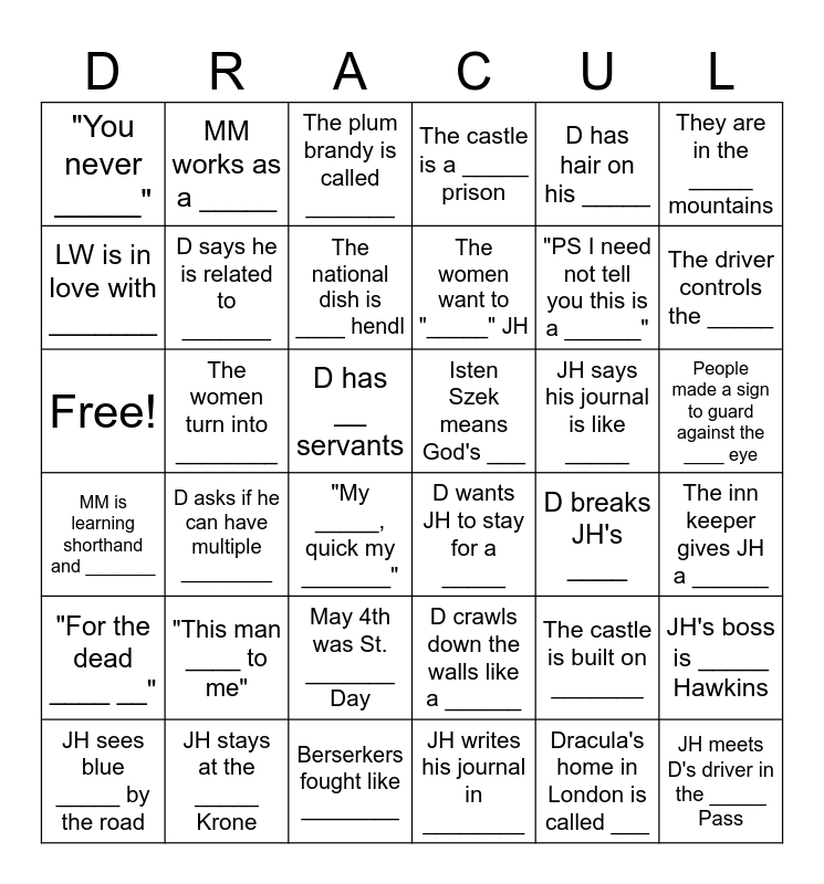 This bingo card has 36 words: D crawls down the walls like a ______, May 4th was St. _______ Day, JH writes his journal in ________, LW is in love with _______, MM is learning shorthand and _______, Isten Szek means God's ___, D says he is related to _______, Berserkers fought like ________, D has hair on his _____, The castle is built on _______, The driver controls the _____, The castle is a _____ prison, JH's boss is _____ Hawkins, The women turn into ________, The women want to "_____" JH, "You never _____", "For the dead ____ __", JH says his journal is like _____, Free!, The plum brandy is called _______, D has __ servants, D asks if he can have multiple ________, D wants JH to stay for a _____, "My _____, quick my _______", D breaks JH's ____, MM works as a _____, "PS I need not tell you this is a ______", JH stays at the _____ Krone, The national dish is ____ hendl, They are in the _____ mountains, JH meets D's driver in the _____ Pass, JH sees blue _____ by the road, The inn keeper gives JH a ______, People made a sign to guard against the ____ eye, "This man ____ to me" and Dracula's home in London is called ___.