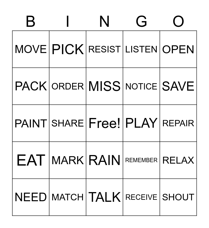 This bingo card has a free space and 24 words: MARK, MATCH, MISS, NEED, OPEN, MOVE, PACK, PICK, PLAY, RAIN, NOTICE, PAINT, REMEMBER, RELAX, ORDER, RECEIVE, REPAIR, RESIST, SAVE, SHARE, SHOUT, EAT, LISTEN and TALK.