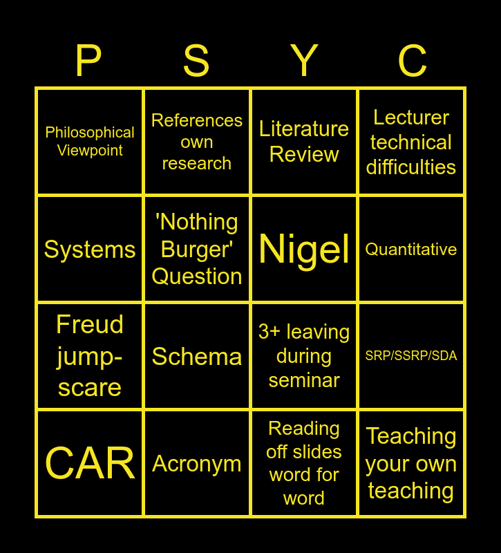 This bingo card has 26 words: Complicated Descriptions, 'Writing your thesis', Quantitative, Qualitative, Systems, Philosophical Viewpoint, 'Nothing Burger' Question, References own research, Reading off slides word for word, Problematic Statement, Freud jump-scare, 3+ leaving during seminar, Advertising Working in NHS Service, Sound not working, SRP/SSRP/SDA, CBT Bashing, Lecturer technical difficulties, Teaching your own teaching, Literature Review, CAR, Schema, Placement, Acronym, Silence > 5 seconds, Nigel and Comment on number of attendees to lecture.