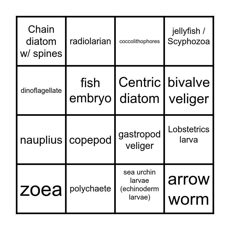 This bingo card has 16 words: polychaete, Lobstetrics larva, coccolithophores, Chain diatom w/ spines, nauplius, radiolarian, gastropod veliger, sea urchin larvae (echinoderm larvae), dinoflagellate, fish embryo, zoea, jellyfish / Scyphozoa, copepod, bivalve veliger, Centric diatom and arrow worm.