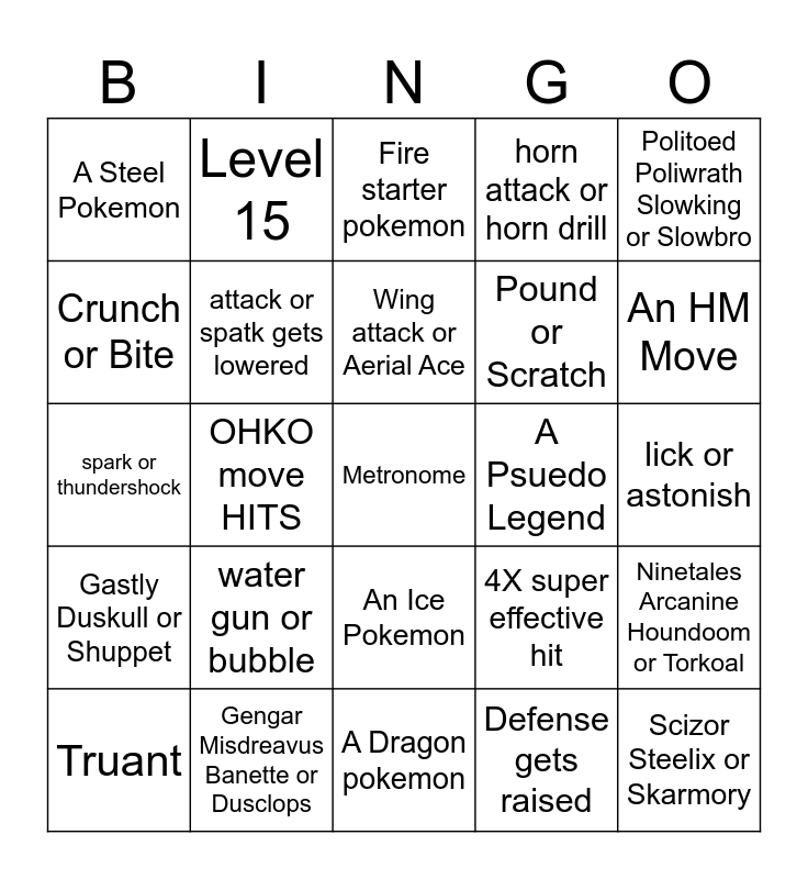 This bingo card has a free space and 96 words: Crabhammer, or Waterfall, Color Change, A "KING" Pokemon, A Psuedo Legend, Legendary Pokemon, Super Effective, Memento, Explosion, Self Destruct, Pokemon is immune, Rollout or Ice Ball, Struggle, Barrage or Spike Cannon, fully evolved starter Pokemon, Contact ability Procs, An HM Move, Magnitude or Earthquake, Crunch or Bite, Wing attack or Aerial Ace, Aromatherapy or Sweet scent, Bounce or Dig, A fossil Pokemon, An Eeveelution, Pewter City, Beat Rival 2, An Electric Pokemon, An Ice Pokemon, A Dragon pokemon, A Dark Pokemon, A Steel Pokemon, Steel wing or Iron Tail, Kinesis or Sand Attack, Perish Song, 4X super effective hit, A Horse, A baby Pokemon, Politoed Poliwrath Slowking or Slowbro, Victreebell Vileplume Bellossom or Exeggutor, Ninetales Arcanine Houndoom or Torkoal, Ice beam Thunderbolt or Flamethrower, Thunder Blizzard or Fire Blast, OHKO move HITS, Perish song or Sing, Truant, Scizor Steelix or Skarmory, Gengar Misdreavus Banette or Dusclops, Gastly Duskull or Shuppet, Fire starter pokemon, grass starter pokemon, water starter pokemon, a Psychic Pokemon, Huntail Gorebyss Relicanth or Wailord, One of the Regis, Legendary bird, Legendary beast, above 601 BST, Below 240 BST, Sharpedo Crawdaunt Cacturne or Shiftry, A Dark type Pokemon, Starmie Cloyster Dewgong or Tentacruel, Alakazam Mr Mime Hypno or Mewtwo, Pidgey Spearow Hoothoot or Tailow, Caterpie Weedle Spinarak or Wurmple, Metapod Kakuna cascoon or silcoon, Exploud Blissey Snorlax or Kangaskhan, MILK (the mon, move, or item), Poisoned, Paralyzed, Asleep, Speed gets raised, Attack gets raised, Defense gets raised, Blast Burn Hydro Cannon or Frenzy Plant, Mega kick or Mega Punch, Endure or Transform, Rest or Snore, hidden power or nature power, Machamp, hitmonlee, hitmonchan or hitmontop, Defense or Spdef gets lowered, attack or spatk gets lowered, A pure POISON pokemon, Pound or Scratch, horn attack or horn drill, drill peck or peck, megahorn or twineedle, dragon rage or outrage, ember or flame wheel, spark or thundershock, water gun or bubble, absorb mega drain or giga drain, sludge or sludge bomb, lick or astonish, rock throw or rock slide, mist ball or luster purge, a 100+ power move, Level 12, Level 15 and a 2 turn move.