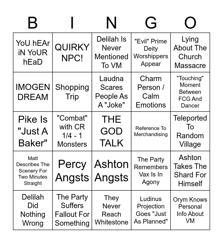 This bingo card has a free space and 24 words: Percy Angsts, The Party Suffers Fallout For Something, Laudna Scares People As A "Joke", Delilah Did Nothing Wrong, Lying About The Church Massacre, YoU hEAr iN YoUR hEaD, IMOGEN DREAM, QUIRKY NPC!, Reference To Merchandising, Ashton Angsts, Charm Person / Calm Emotions, Pike Is "Just A Baker", The Party Remembers Vax Is In Agony, Ashton Takes The Shard For Himself, Shopping Trip, Ludinus Projection Goes "Just As Planned", Teleported To Random Village, Delilah Is Never Mentioned To VM, "Touching" Moment Between FCG And Dancer, "Combat" with CR 1/4 - 1 Monsters, Orym Knows Personal Info About VM, Matt Describes The Scenery For Two Minutes Straight, "Evil" Prime Deity Worshippers Appear and They Never Reach Whitestone.