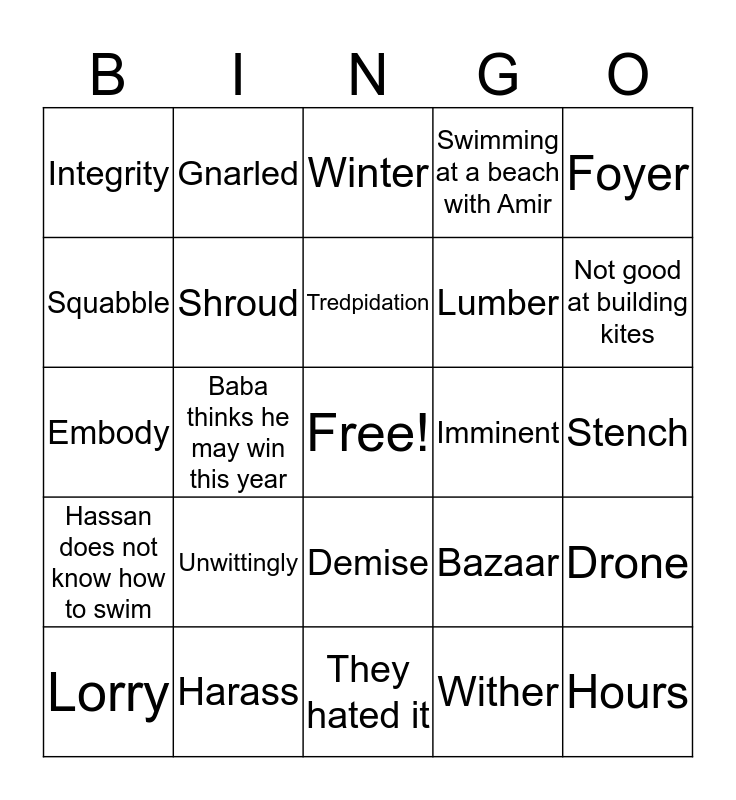 This bingo card has a free space and 24 words: Unwittingly, Harass, Tredpidation, Lorry, Foyer, Integrity, Squabble, Gnarled, Imminent, Demise, Lumber, Embody, Bazaar, Drone, Shroud, Wither, Stench, Winter, Not good at building kites, Baba thinks he may win this year, Hours, Hassan does not know how to swim, Swimming at a beach with Amir and They hated it.