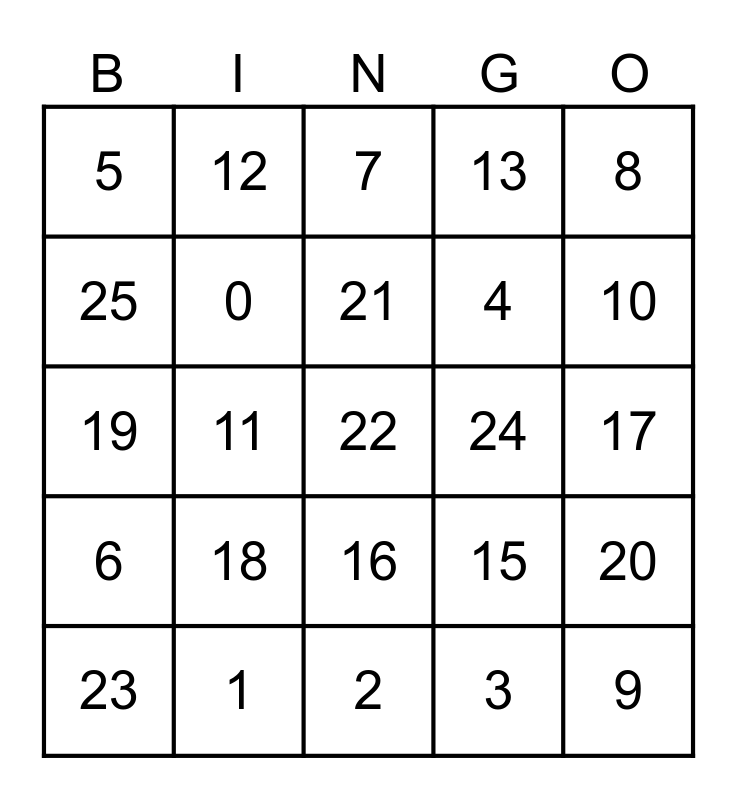 This bingo card has 26 words: 6, 1, 21, 3, 8, 5, 0, 7, 4, 9, 25, 11, 2, 15, 17, 14, 12, 16, 13, 20, 19, 18, 22, 24, 10 and 23.