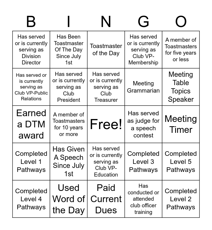 This bingo card has a free space and 35 words: Has competed in more than one type of Speech Contest, Has been a member of a different club, Has been a member of a club outside of Nevada, Has served or is currently serving as Club President, Has served or is currently serving as Club VP-Education, Has served or is currently serving as Club VP-Membership, Has served or is currently serving as Club VP-Public Relations, Has served or is currently serving as Club Secretary, Has served or is currently serving as Club Treasurer, Has served or is currently serving as Club Sergeant of Arms, Earned a DTM award, A member of Toastmasters for five years or less, Currently a member of two clubs or more, Has served or is currently serving as Area Director, Has served or is currently serving as Division Director, Has served as judge for a speech contest, Has conducted or attended club officer training, A member of Toastmasters for 10 years or more, Completed Level 1 Pathways, Completed Level 2 Pathways, Completed Level 3 Pathways, Completed Level 4 Pathways, Completed Level 5 Pathways, Used Word of the Day, Toastmaster of the Day, Meeting Table Topics Speaker, Meeting General Evaluator, Meeting Evaluator, Meeting Grammarian, Meeting Timer, Meeting Ah-Counter, Paid Current Dues, Has Given A Speech Since July 1st, Has Been Toastmaster Of The Day Since July 1st and Attended a Paul's Wednesday Workshop.