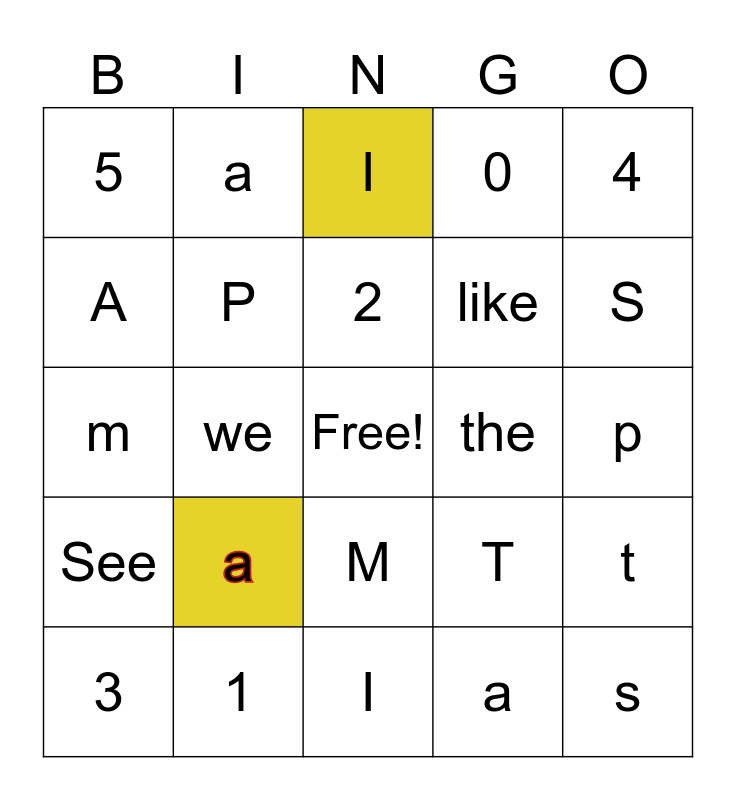 This bingo card has a free space and 24 words: a, 1, 2, 3, 4, 5, A, a, the, M, like, m, T, t, P, a, p, I, S, we, s, See, 0 and I.