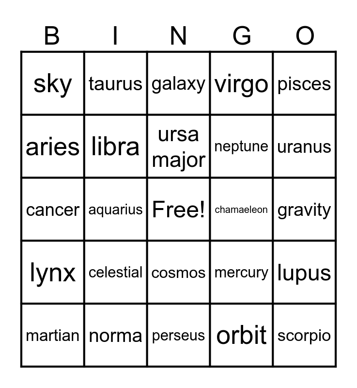 This bingo card has a free space and 75 words: stars, constellations, galaxy, sun, supernova, moon, asteroid, earth, saturn, pluto, orion, ursa minor, ursa major, aries, capricorn, aquarius, leo, scorpio, saggitarius, pisces, gemini, cancer, libra, taurus, virgo, hercules, astro, telescope, nasa, comet, mars, jupiter, venus, mercury, uranus, neptune, milky way, auroraborealis, gravity, orbit, meteor, eclipse, solar system, astonomy, astronaut, alien, martian, sky, cloud, night, dawn, cosmos, nebula, red giant, solstice, space, starburst, universe, galactic, apollo, celestial, galileo, sola solar, solar, andromeda, chamaeleon, crater, draco, hydra, lupus, lynx, norma, pegasus, perseus and phoenix.