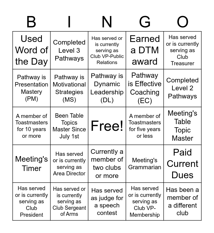 This bingo card has a free space and 44 words: Has competed in more than one type of Speech Contest, Has been a member of a different club, Has been a member of a club outside of Nevada, Has served or is currently serving as Club President, Has served or is currently serving as Club VP-Education, Has served or is currently serving as Club VP-Membership, Has served or is currently serving as Club VP-Public Relations, Has served or is currently serving as Club Secretary, Has served or is currently serving as Club Treasurer, Has served or is currently serving as Club Sergeant of Arms, Earned a DTM award, A member of Toastmasters for five years or less, Currently a member of two clubs or more, Has served or is currently serving as Area Director, Has served or is currently serving as Division Director, Has served as judge for a speech contest, Has conducted or attended club officer training, A member of Toastmasters for 10 years or more, Completed Level 1 Pathways, Completed Level 2 Pathways, Completed Level 3 Pathways, Completed Level 4 Pathways, Completed Level 5 Pathways, Used Word of the Day, Meeting's Toastmaster Of The Day, Meeting's Table Topic Master, Meeting's Table Topics Speaker, Meeting's Evaluator, Meeting's Grammarian, Meeting's Timer, Meeting's Ah-Counter, Paid Current Dues, Given A Speech Since July 1st, Been Toastmaster Of The Day Since July 1st, Been Table Topics Master Since July 1st, Attended Paul's Speech Wednesday Workshop, Joined Toastmasters in 2023, Given Ice Breaker Speech, Pathway is Dynamic Leadership (DL), Pathway is Presentation Mastery (PM), Pathway is Effective Coaching (EC), Pathway is Leadership Development (LD), Pathway is Motivational Strategies (MS) and Pathway is Persuasive Influence (PI).