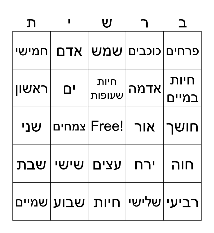 This bingo card has a free space and 24 words: שישי, שבוע, חיות שעופות, שמיים, פרחים, חמישי, ראשון, אדם, אור, עצים, אדמה, שני, ירח, חוה, ים, שלישי, חושך, שמש, חיות במיים, צמחים, רביעי, שבת, כוכבים and חיות.
